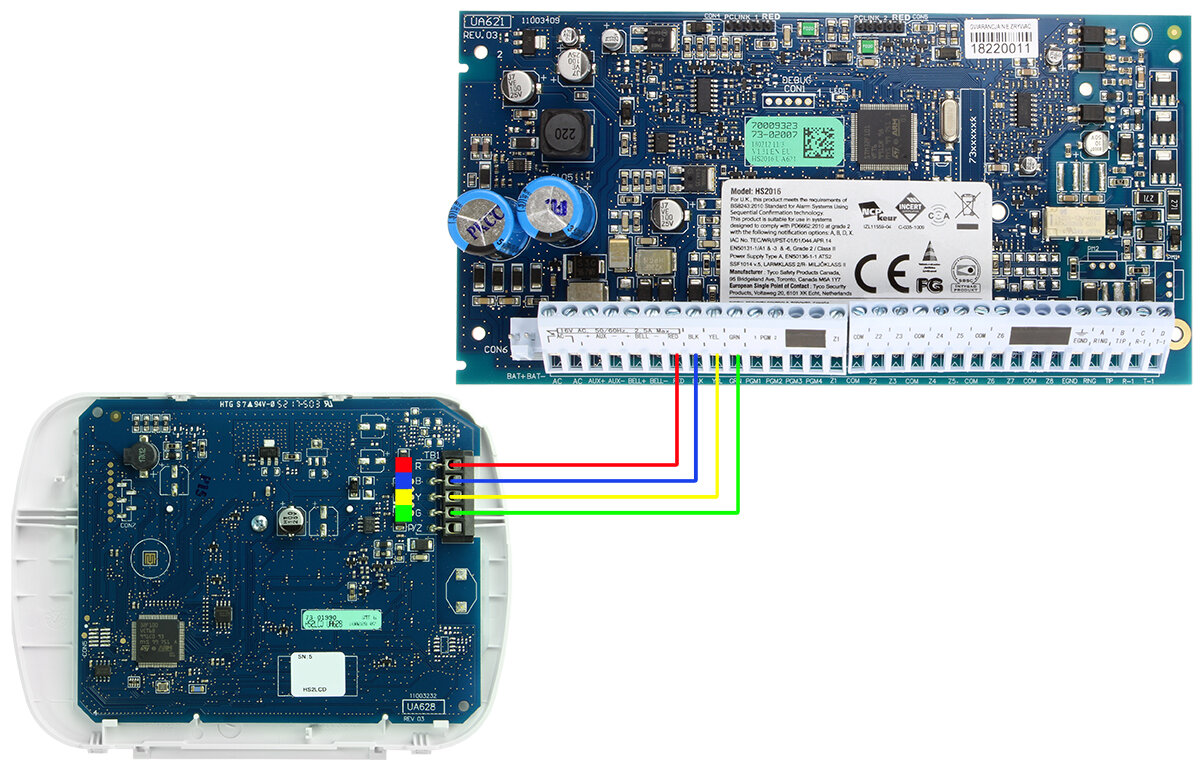 Anslutningsdiagram för DSC-knappsats (knappsats) HS2LCD, HS2LEDE1 till DSC-huvudkort HS2016, HS2032, HS2064: