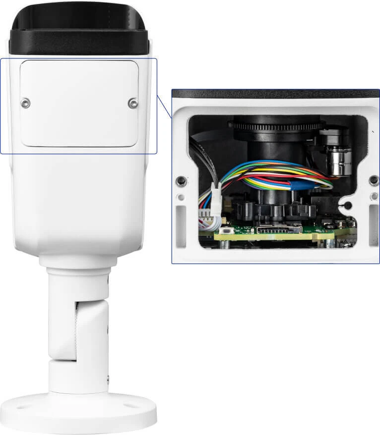 Biała kamera IP BCS z widocznym wnętrzem, ukazującym kolorowe przewody i elektronikę. Kamera zamontowana jest na regulowanym uchwycie, a obok znajduje się zbliżenie na jej wnętrze.