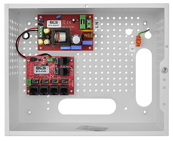 PoE-kit för strömförsörjning av BCS IP-videomonitorer. Fyra PoE-utgångar för strömförsörjning av videomonitorer. Två LAN-ingångar/utgångar, varav en utgång kan konfigureras som PoE (beroende på konfiguration). De främsta fördelarna är: hög kvalitet och säkerhet för in- och utgångarna, optisk signalering av överföring och strömförsörjning för varje utgång, möjlighet till kaskadkoppling med efterföljande BCS-SP0406- eller BCS-SP0812-switchar, möjlighet att inaktivera PoE-funktionen för varje utgång med hjälp av en jumper (vilket ger en standard LAN 10/100Mb-utgång), vilket gör det möjligt att ansluta externa paneler och andra nätverksenheter som inte stöder PoE-strömförsörjning.