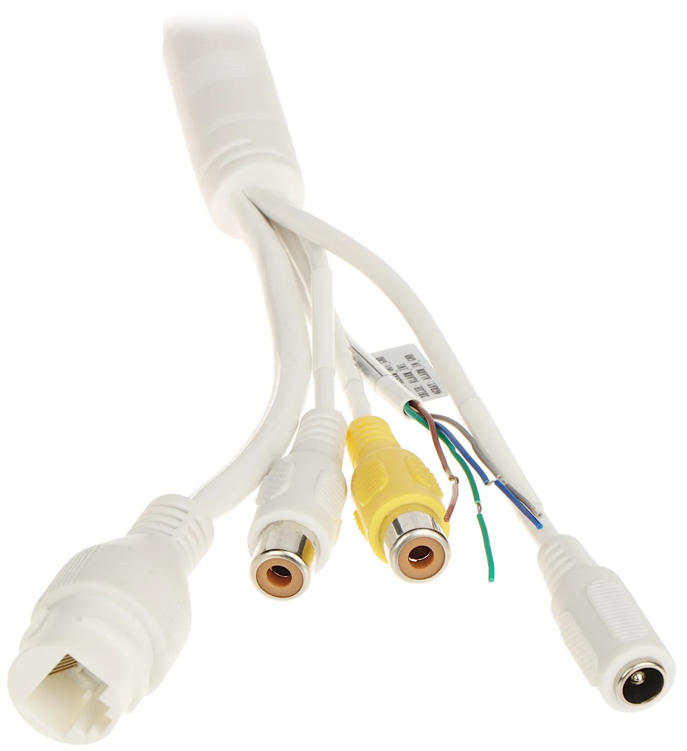 Zdjęcie przedstawia zestaw białych kabli z różnymi złączami, w tym RJ45, RCA i zasilającym. Kable są splecione i mają kolorowe oznaczenia na końcówkach.