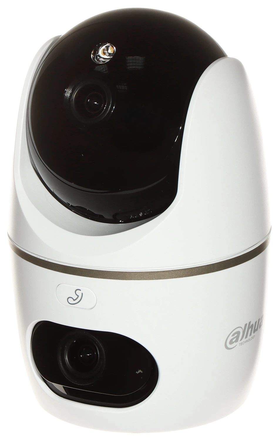 Biała, obrotowa kamera WiFi marki Dahua z czarną kopułą i logo producenta na obudowie. Kamera posiada dwa obiektywy i przycisk na przedniej części urządzenia.